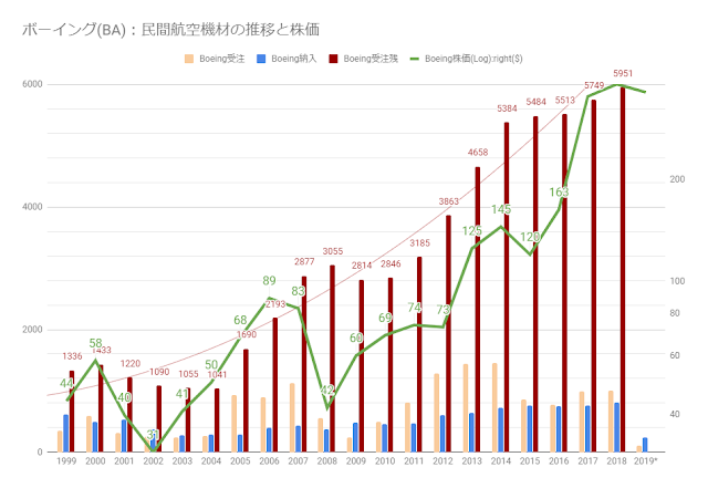 ボーイング(BA)の株価(-)の長期的トレンドは [受注残](■) に呼応しているように見えます。